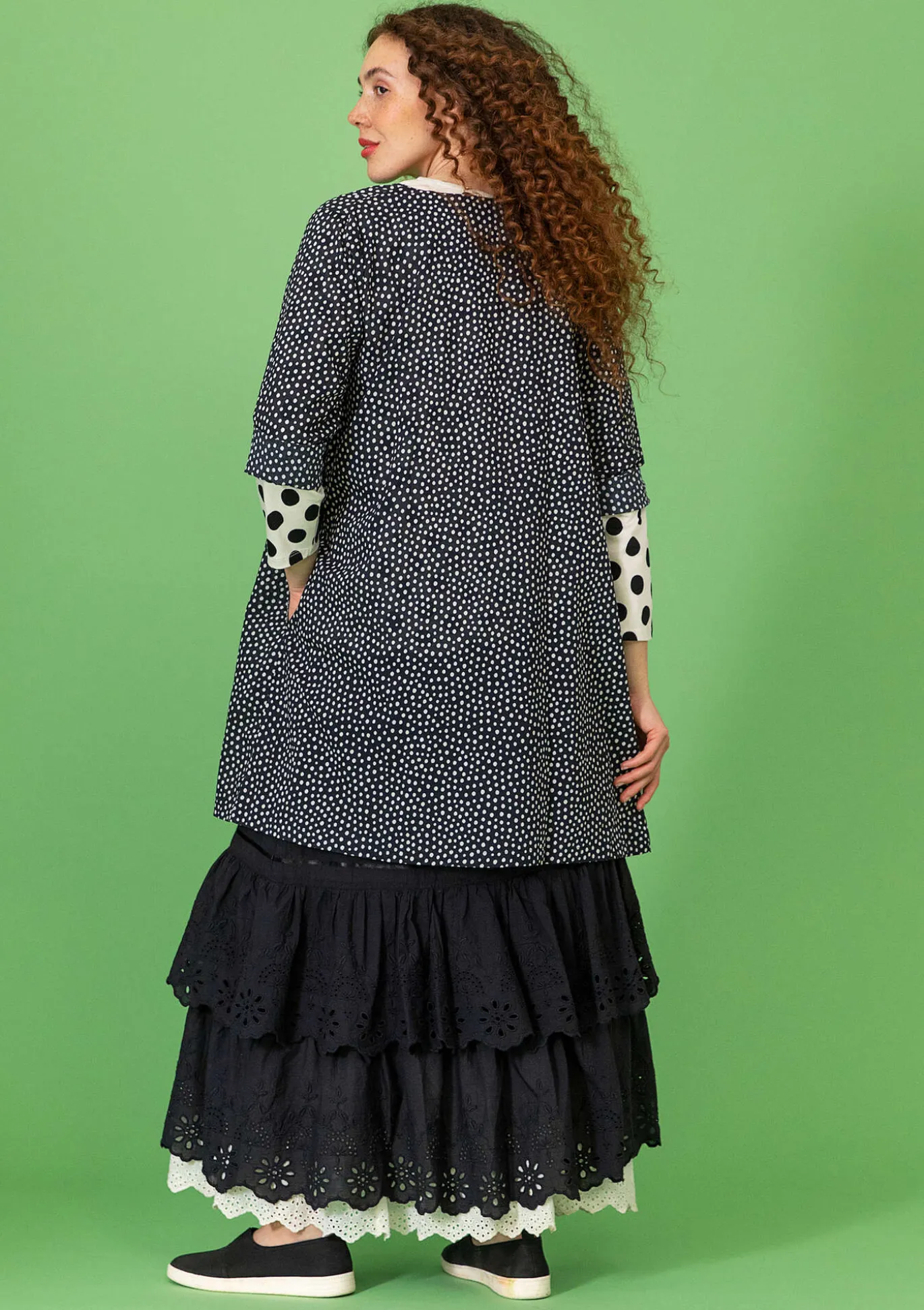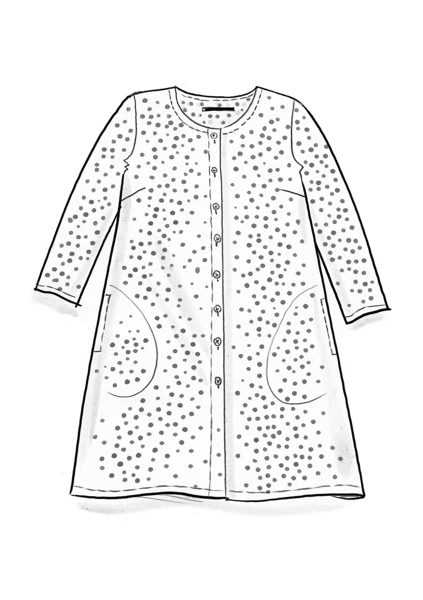 Alas asti napitettava tunika, jossa on painettu pilkkukuvio. Monikäyttöinen malli, jossa on pyöreä pääntie ja 3/4-pituiset hihat. Sivuissa piilotaskut.