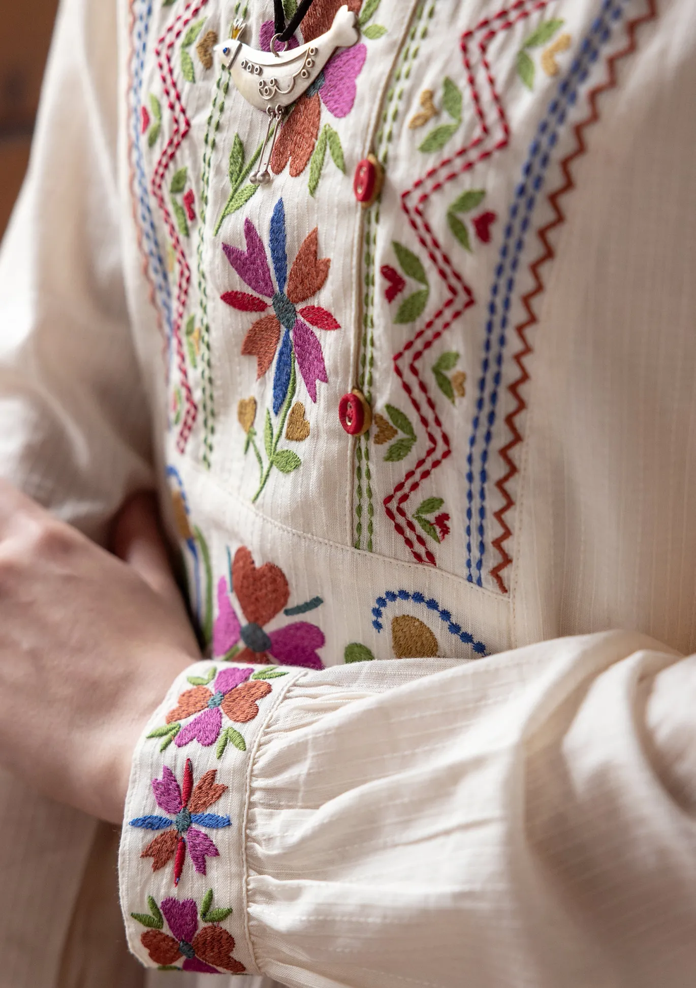 Kangastunika, jonka miehustassa, hihansuissa ja boordina helmassa on kauniit kirjailut. Pitkät hihat sekä edessä kaarroke ja rypytys. Pyöreä, kontrastivärisellä nauhalla kantattu pääntie. Kontrastiväriset kangaspäällysteiset napit kaarrokkeessa ja hihansuissa.