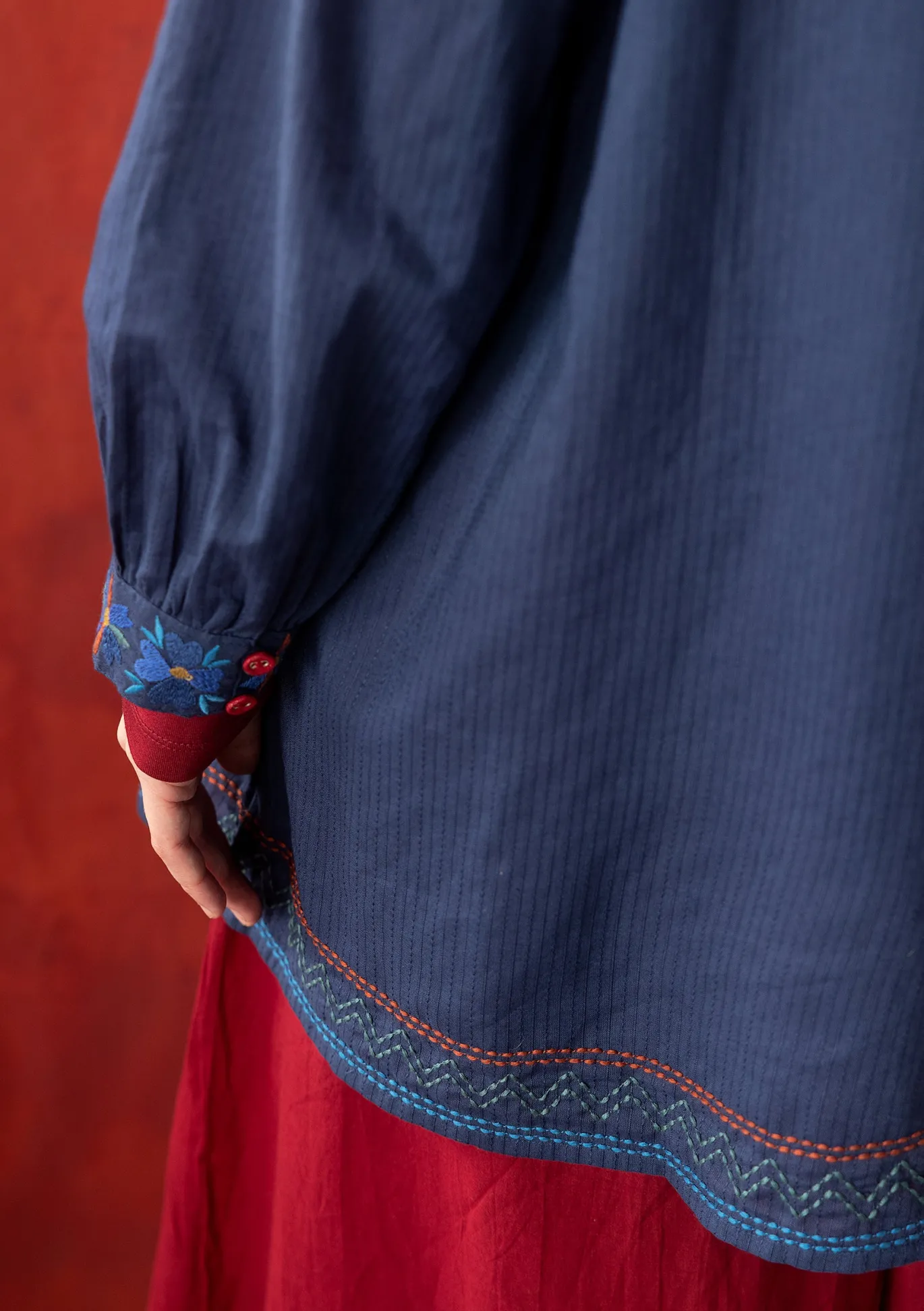 Kangastunika, jonka miehustassa, hihansuissa ja boordina helmassa on kauniit kirjailut. Pitkät hihat sekä edessä kaarroke ja rypytys. Pyöreä, kontrastivärisellä nauhalla kantattu pääntie. Kontrastiväriset kangaspäällysteiset napit kaarrokkeessa ja hihansuissa.