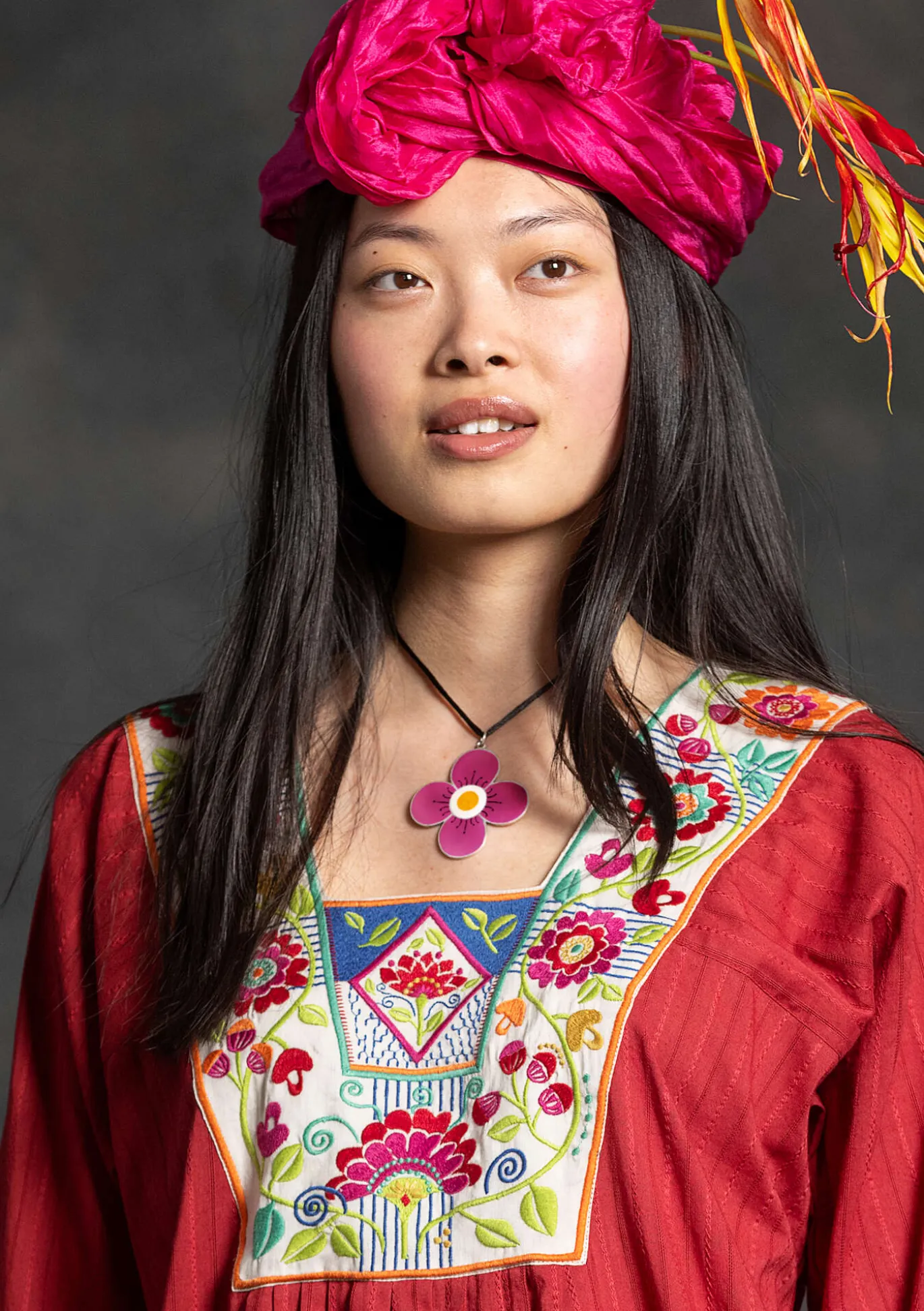 Ylellinen kaulakoru, jossa on värikäs kukkariipus emaloitua 925 sterling-hopeaa. 62 cm pitkä kaulanauha ja hopeasolki. Toimitetaan pienessä kangaspussissa.