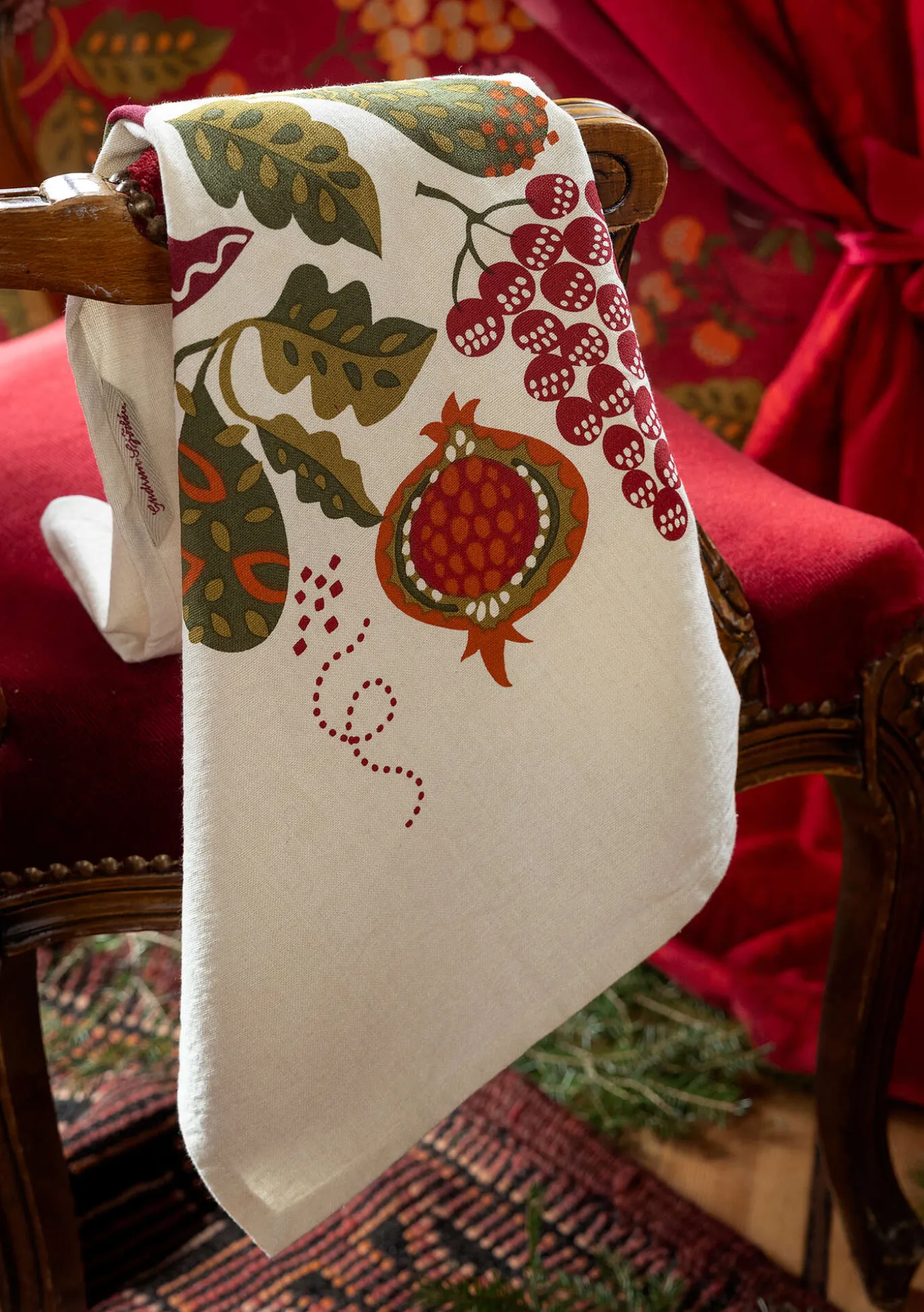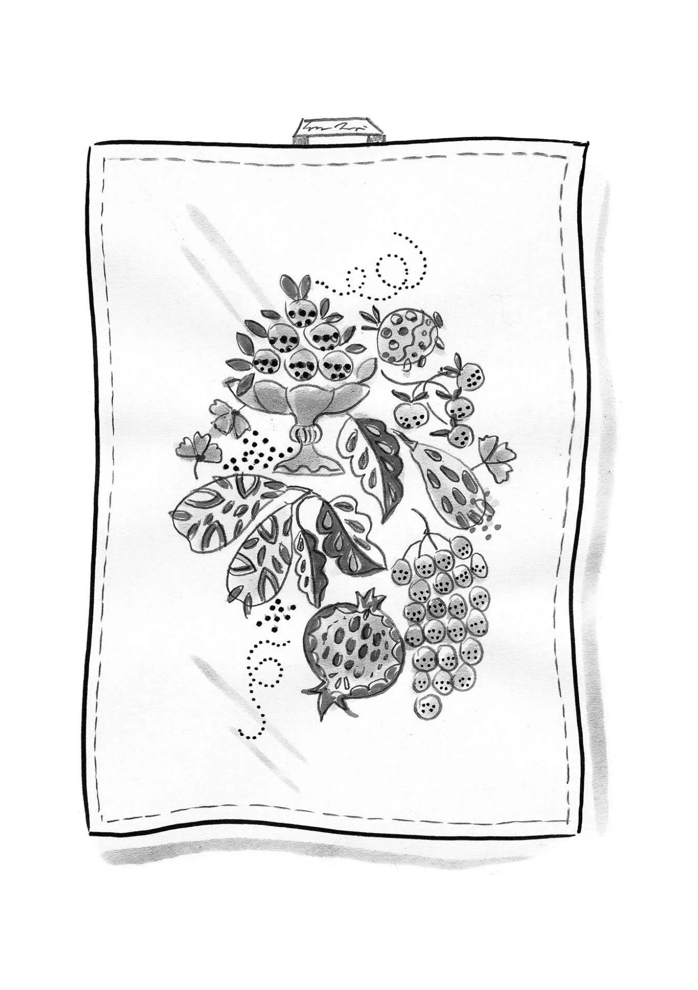 Keittiöpyyhettä somistaa keskelle sijoitettu hedelmiä esittävä painokuvio, ja se piristää keittiötä hauskasti. Kudottu ripustusnauha.
