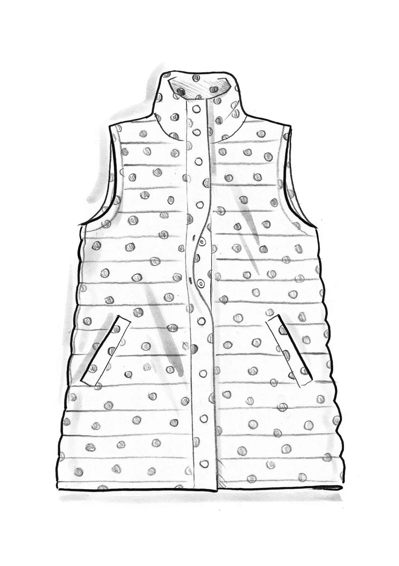 Kevyesti topatussa liivissä on korkea kaulus ja painettu pilkkukuosi. Edessä painonapit ja sivuissa taskut. Sopii mainiosti käytettäväksi takin alla tai päällä – tai neulepuseron lämmikkeeksi.