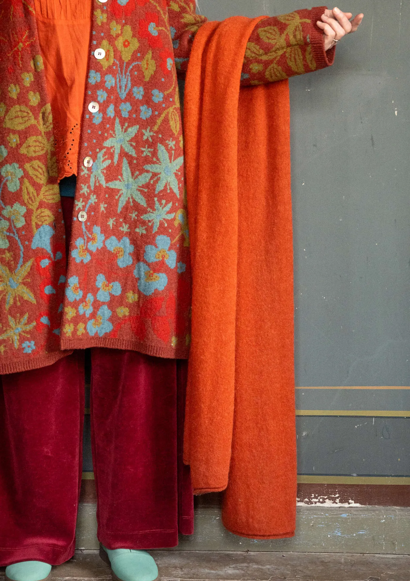 Lämmin ja monikäyttöinen kaulahuivi, jonka päissä on sievät rullareunukset. Neulottu pehmeästä ja kevyesti kuohkeasta alpakka-villasekoitteesta.