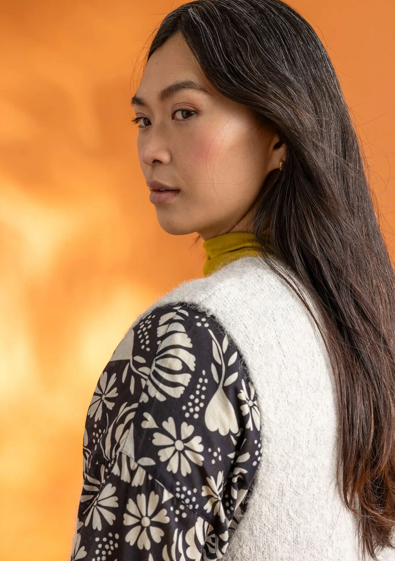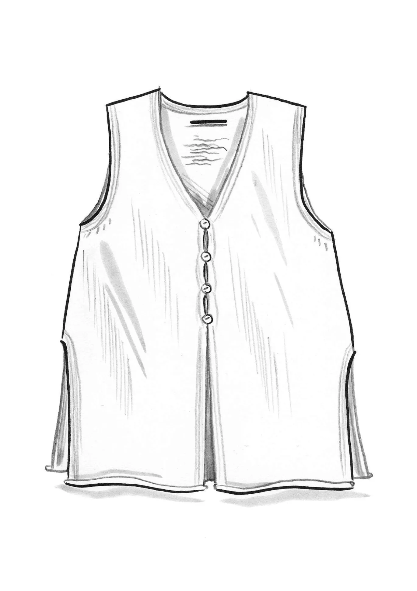 Pitkä neuleliivi. Neulottu pehmeästä ja hieman pörröisestä meleeratusta langastamme. Edessä helmiäisnapit ja virkatut nappilenkit ja sivuissa halkiot.
