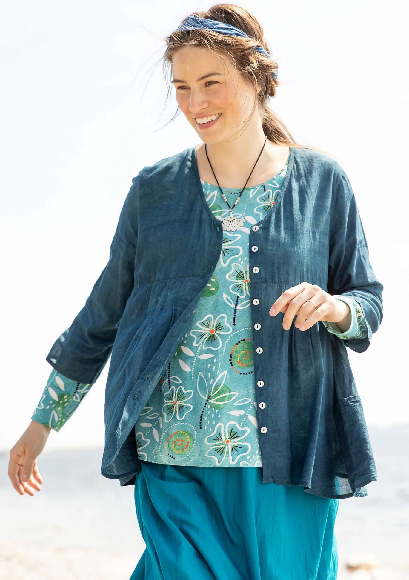 Alas asti napitettava pusero, joka on värjätty kasviväreillä. Leikkaus rinnan alla ja hiuslaskokset edessä ja takana. V-pääntie, pitkähköt 3/4-hihat sekä sivutaskut.