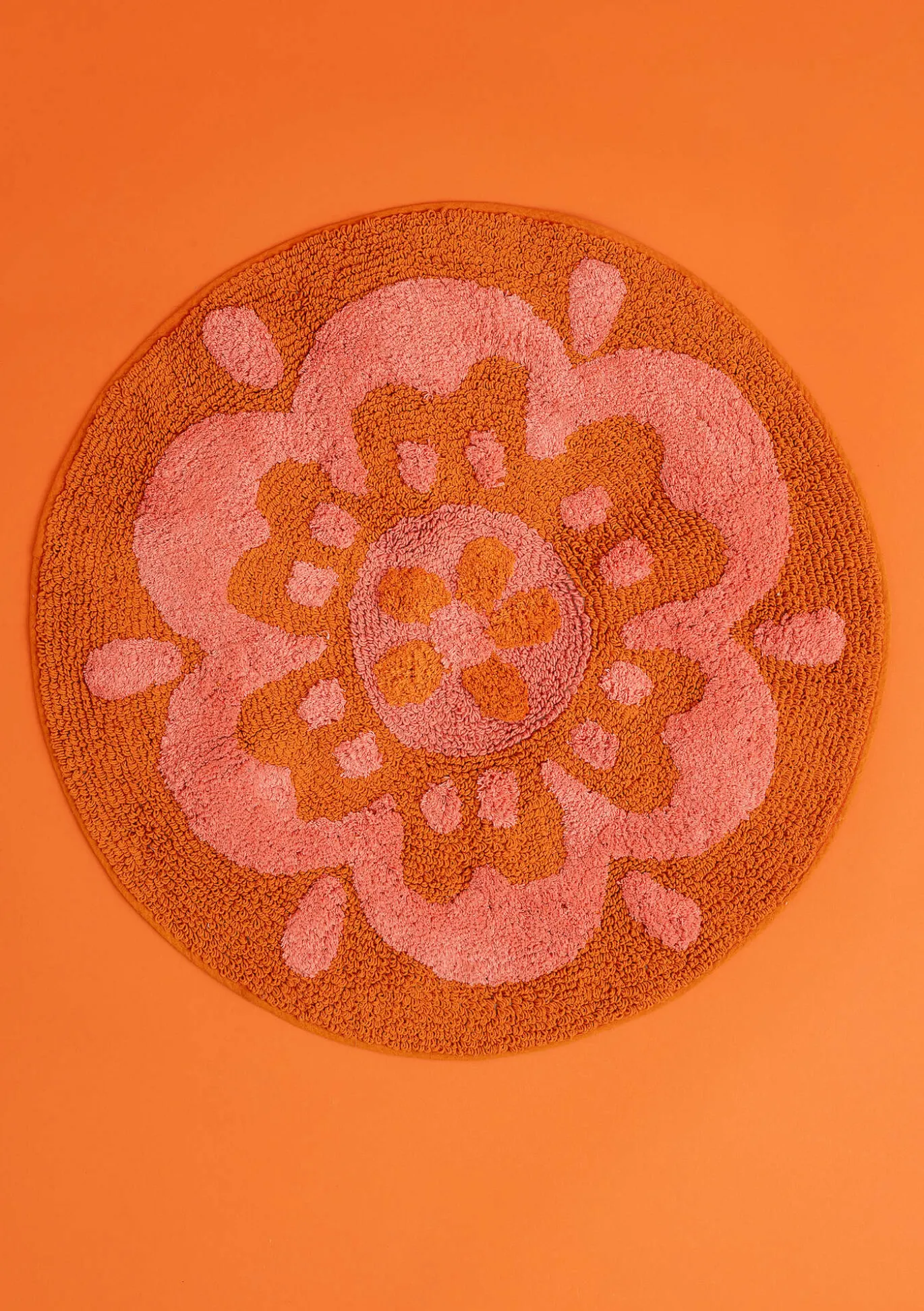 Pyöreä kylpyhuonematto, jossa on iso kukkakuvio. Tuftattu matto, josta on saatavilla kaksi eri korkeutta: lenkit ja leikattu nukka. Luistamaton pinnoitettu kääntöpuoli.
