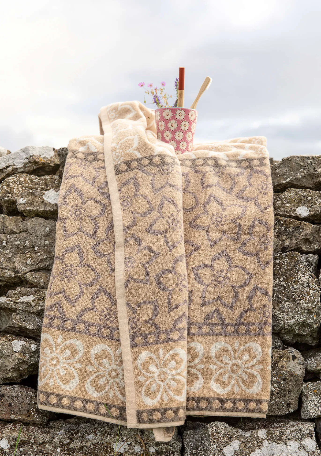 Kylpypyyhe, jossa on kukka- ja pilkkukuvio. Kontrastiväriset reunat ja ripustuslenkki lyhyellä ja pitkällä sivulla.