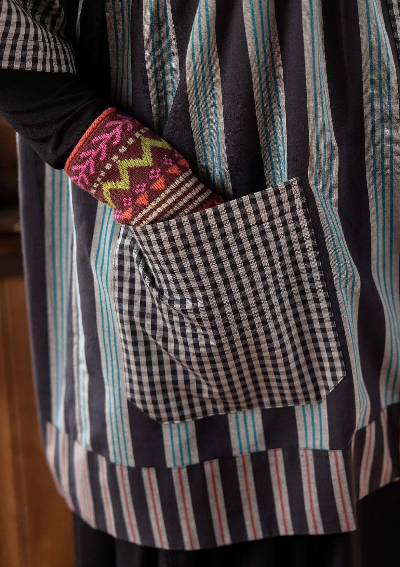 Alas asti napitettava taiteilijanpaita, jossa on kudottuja raitoja ja lankavärjättyjä ruutuja. Leikkaus vyötäröllä sekä rypytys miehustassa ja selässä. V-pääntie ja kyynärpääpituiset hihat sekä lasketut olkasaumat. Kangaspäällysteiset napit ja paikkatasku.