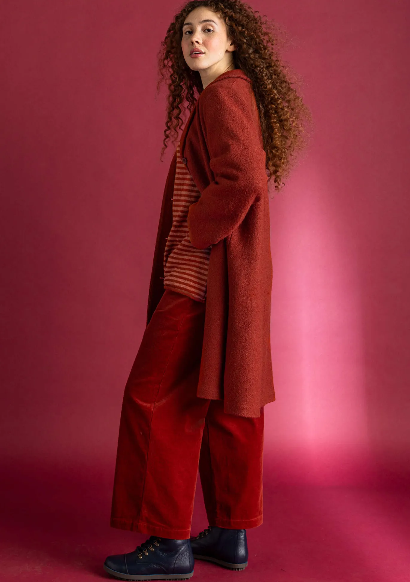 Nilkkapituinen malli, materiaali miellyttävää vakosamettia. Mukaan on sekoitettu myös hiukan elastaania, mikä parantaa istuvuutta ja lisää vaatteen kulutuskestävyyttä. Sivutaskut ja yksi takatasku. Nappi ja etuhalkio. Vyötärönauhassa takana resori.
