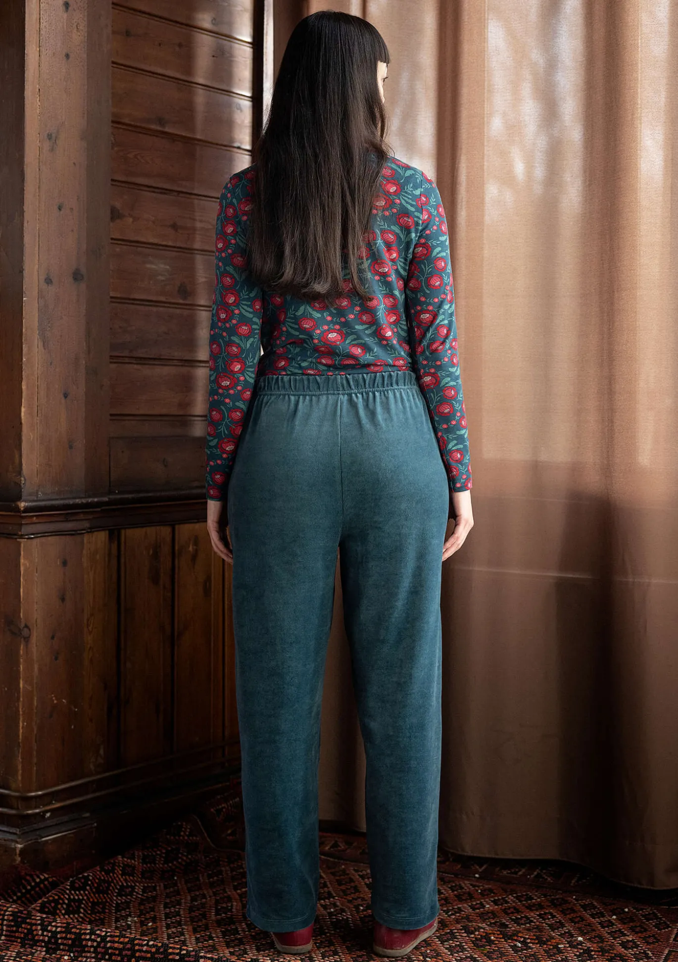 Pitkät veluurihousut, joissa on väljähkö malli. Vyötäröllä ommeltu resorit ja kevyt rypytys sekä taskut sivuissa.