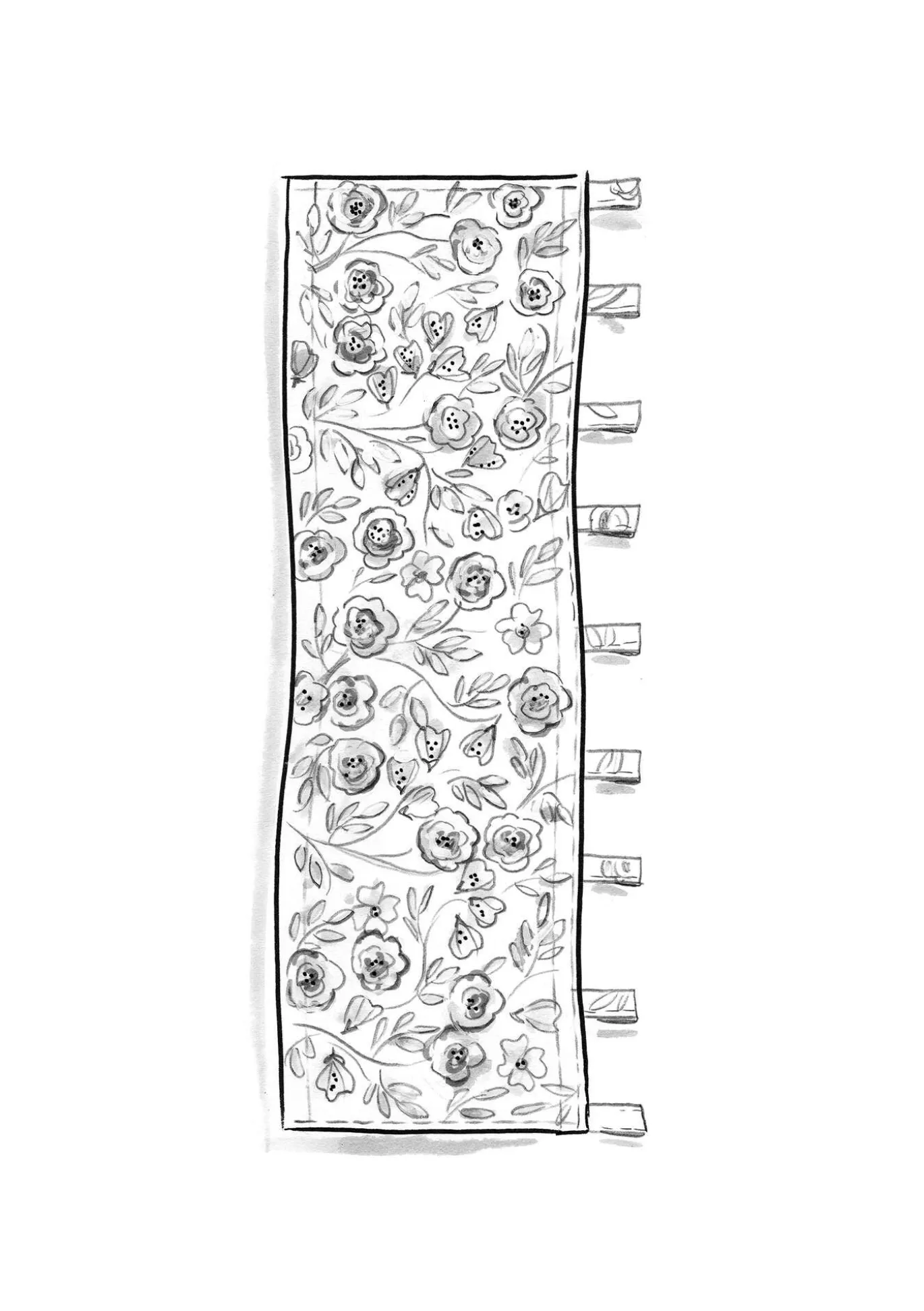 Verhokappa, jossa on kukkakuvio. Kapassa on lenkit helppoon ripustamiseen. Painettu pellavasta ja ekopuuvillasta kudotulle sekoitteelle.